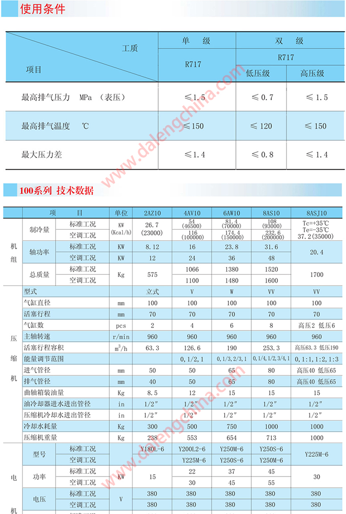 该系列压缩机在冷凝温度≤40℃,蒸发温度单级+5℃~-30℃,双级-25℃~-45℃的范围内,应用于需要实现人工制冷的场合。如石油、化工、制药等工业产品的生产, 食品的低温加工储藏和运输,工厂、医院及公众场所等大型建筑的空气调节等。