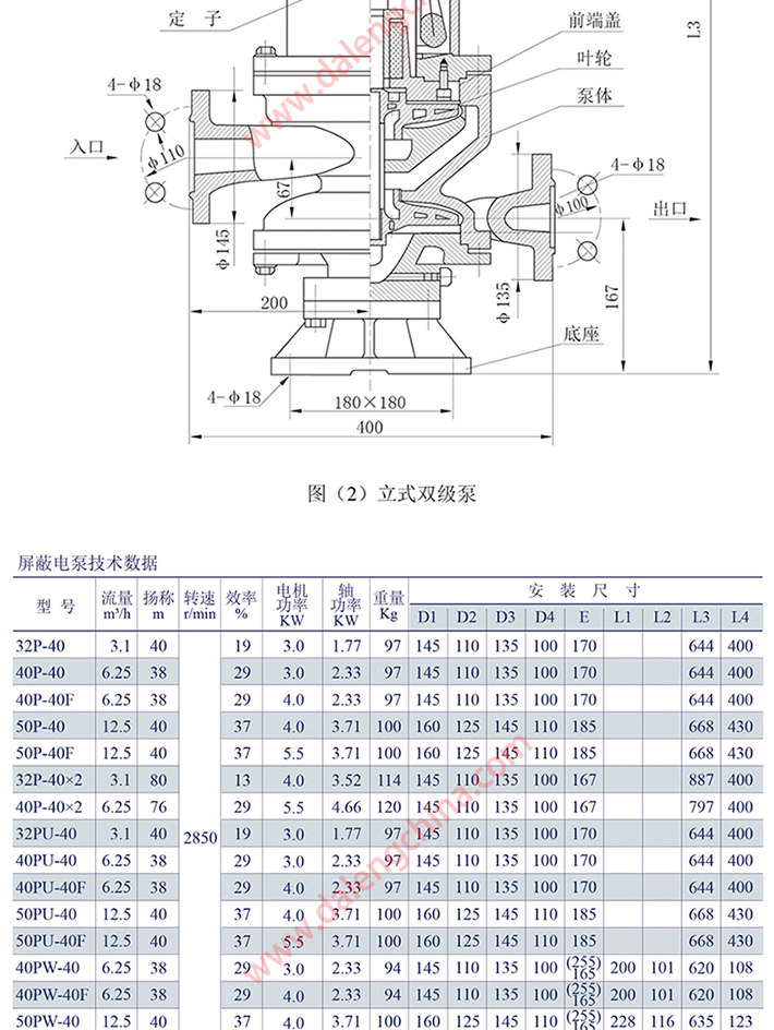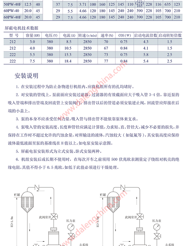 2.配带屏蔽电机:额定电压:380V 额定功率:2.2-7.5KW 频率:50HZ 绝缘等级:E 定子绕组温度:电阴法测定90℃ 工作定额:连续 环境温度:≤40℃ 结构及循环方式