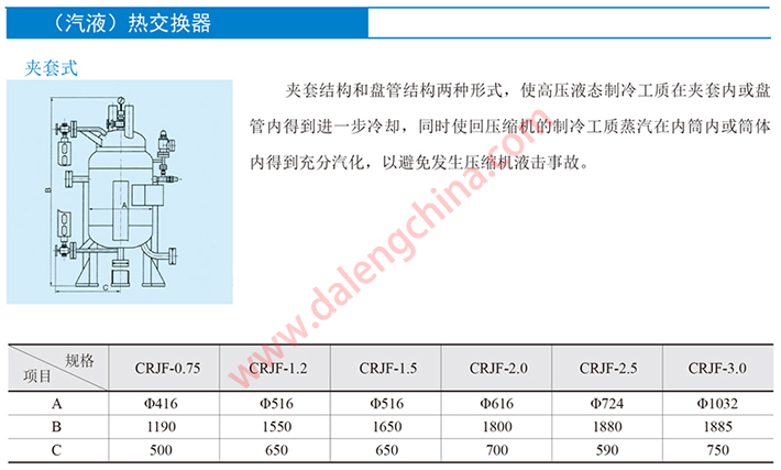 有夹套结构和盘管结构两种形式,使高压液态制冷工质在夹套内或盘管内得到进一步冷却,同时使回压缩机的制冷工质蒸汽在内筒内或筒体内得到充分汽化,以避免发生压缩机液击事故。种类有夹套式、卧式盘管式、立式盘管式。 |
