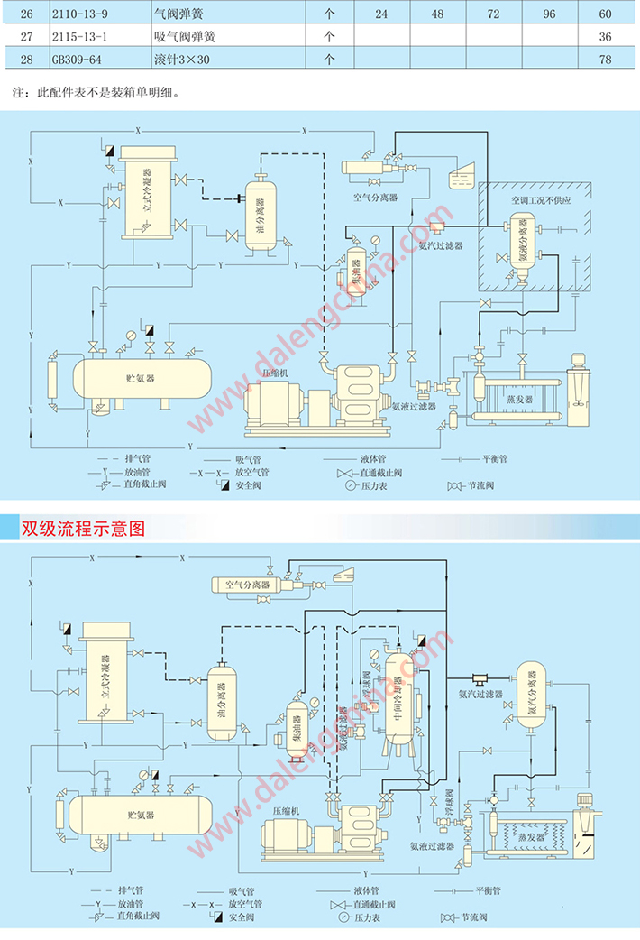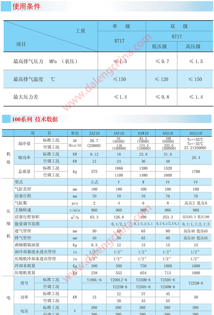 该系列压缩机在冷凝温度≤40℃,蒸发温度单级+5℃~-30℃,双级-25℃~-45℃的范围内,应用于需要实现人工制冷的场合。如石油、化工、制药等工业产品的生产, 食品的低温加工储藏和运输,工厂、医院及公众场所等大型建筑的空气调节等。