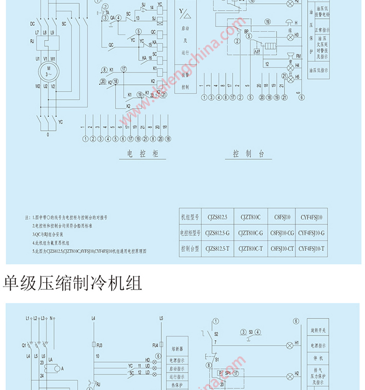 船用活塞式制冷压缩机组中的压缩机有单级、单机双级两种机型,均属高速、多缸、逆流式压缩机,设有能量调节装置,可实现无负荷启动,压缩机还设有装放油阀,可在运转中加油。压缩机组由压缩机、电动机、控制台等组成,其中,单机双级机型还设有中间冷却器。所有机组均设有高效油分离器和自动回油装置。这些部件均安装在同一公共机座上。控制台上装有高、中压、油压继电器,保护机器运行安全可靠。船用机组均经摇摆台试验,可确保在航行中的可靠运行